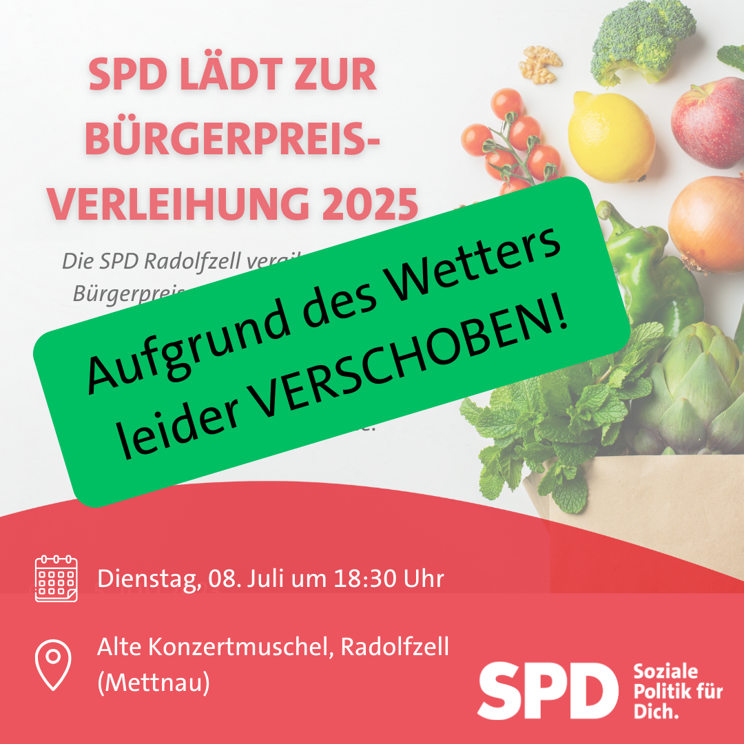 leider müssen wir die für Dienstag geplante Bürgerpreisverleihung verschieben. Die Wetterlage ist zu unsicher, nass und kühl. Wir suchen schnellstmöglich einen neuen Termin im Herbst und informieren dann wieder hier über unsere Webseite.